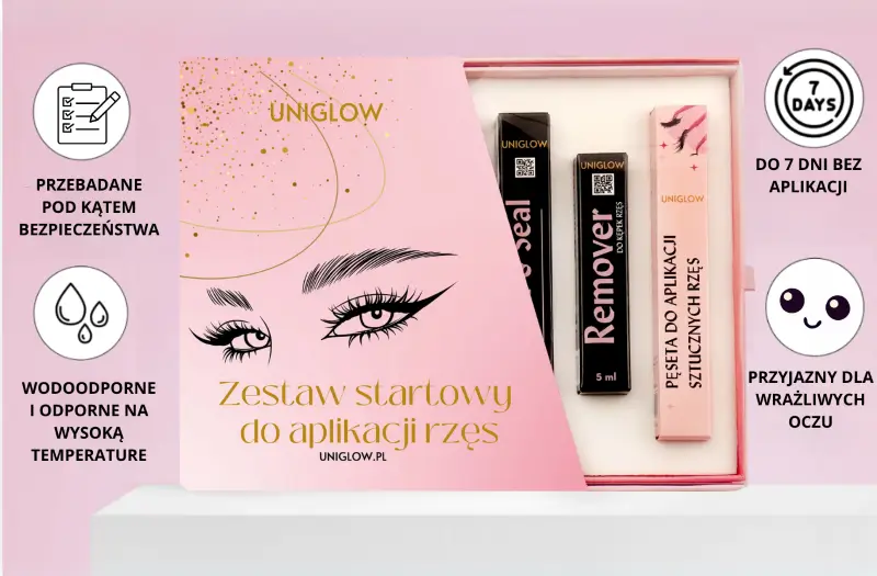 Korzystam z całego setu z UNIGLOW, bo sam proces zakładania jest bardzo prosty, a efekt mega mnie zadowala. Aplikacja trwała parę minut, a trzymają się do 2 tygodni.
