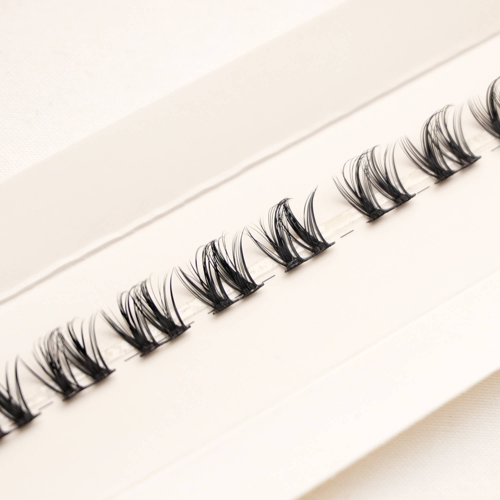Rzęsy typu Straight / Strip Look, czyli równiej długości na całej szerokości paska, bez „kolców”. Tworzą efekt zagęszczenia 3:1 – jak po profesjonalnej aplikacji u kosmetyczki, dając wyrazistsze spojrzenie. Idealne dla osób, które lubią gęstsze “salonowe” rzęsy, gdzie linia kępek nie nachodzi na siebie.