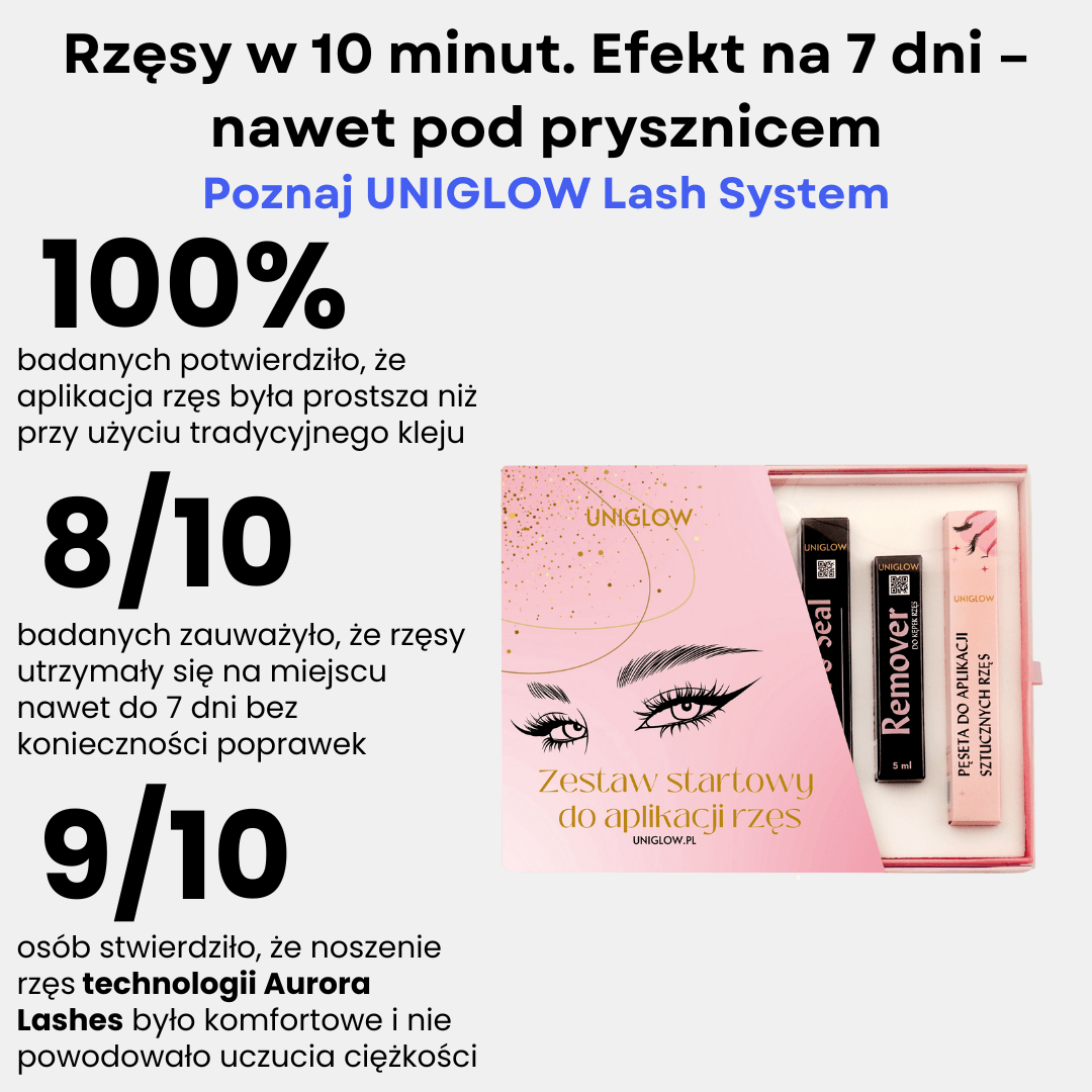 Rzęsy zostały opracowane w oparciu o naszą autorską technologię Aurora Lashes™ by UNIGLOW, wykorzystującą ultracienkie włókna nowej generacji, które idealnie dopasowują się do naturalnej linii oka. Ich lekka, elastyczna konstrukcja sprawia, że są niemal niewyczuwalne w noszeniu, a jednocześnie zachowują perfekcyjny skręt i kształt przez wiele dni.