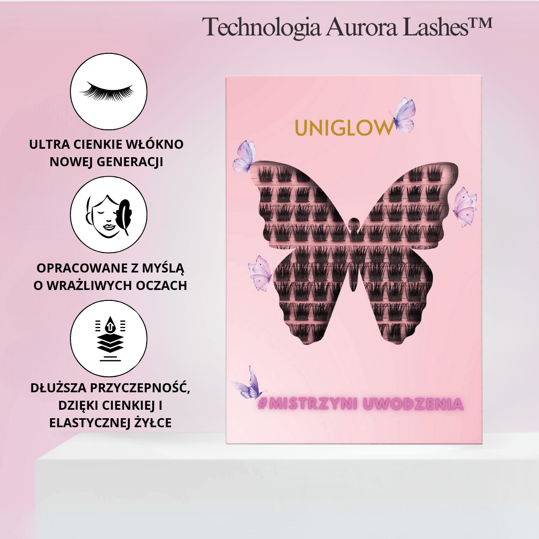 Rzęsy zostały opracowane w oparciu o naszą autorską technologię Aurora Lashes™ by UNIGLOW, wykorzystującą ultracienkie włókna nowej generacji, które idealnie dopasowują się do naturalnej linii oka. Ich lekka, elastyczna konstrukcja sprawia, że są niemal niewyczuwalne w noszeniu, a jednocześnie zachowują perfekcyjny skręt i kształt przez wiele dni.