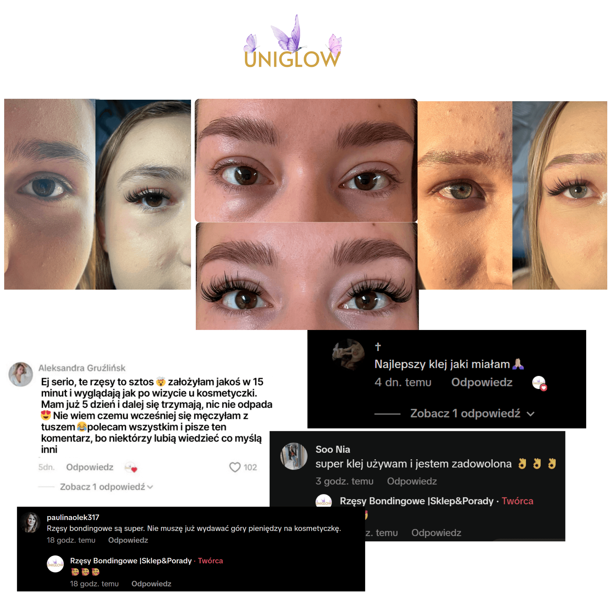 Klej UNIGLOW to innowacyjne rozwiązanie dla osób, które chcą uzyskać spektakularny efekt bez wysiłku i wizyt u kosmetyczki. Dzięki łatwej aplikacji od dołu – inspirowanej nakładaniem tuszu – nawet początkujące osoby mogą precyzyjnie nałożyć rzęsy w kilka chwil. Produkt nie zostawia widocznych śladów kleju i utrzymuje rzęsy nawet do 7 dni. Rzęsy wykonane są z naturalnego włosia, a ich cienki pasek i lekka konstrukcja minimalizują obciążenie, zapewniając komfort i naturalny efekt bez podrażnień.