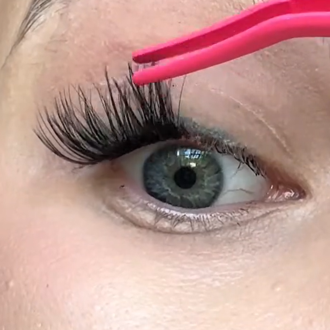 Dodaj Sealer na pęsete i delikatnie zaciśnij kępki razem z naturalnymi rzęsami, aby je utrwalić.